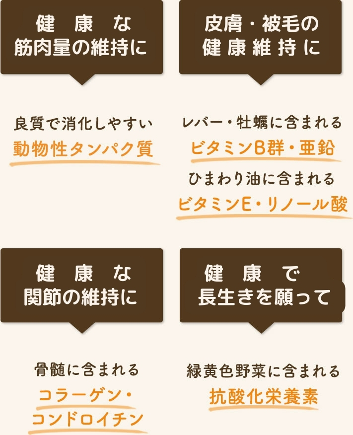 鶏,鹿レバー,さつま芋,人参,舞茸,かぼちゃ,牡蠣,鹿骨,ひまわり油,昆布