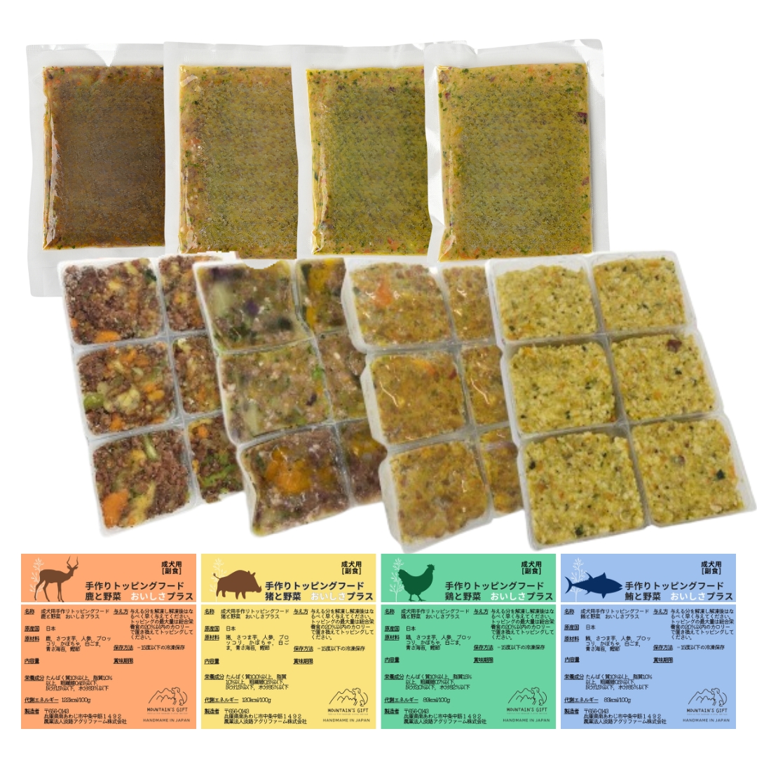 国産無添加 手作りトッピングフード おいしさプラス4種(鮪タイプ)セット (旧 鹿・猪・鶏・まぐろ手作りフードセット)鹿・猪・鶏・まぐろ