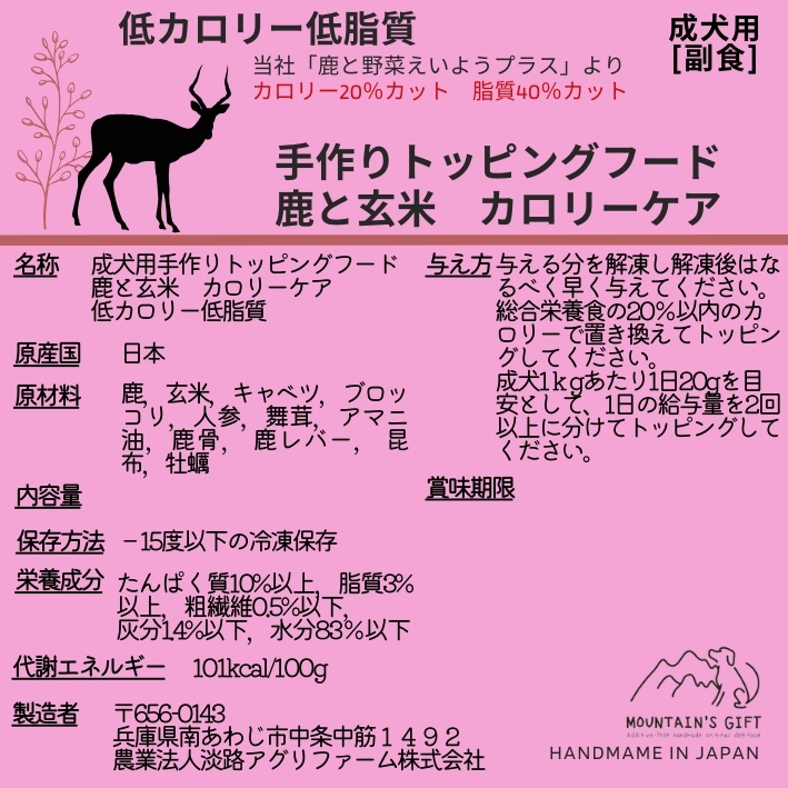 ダイエットしながら健やかなカラダを維持できるよう、当社手作りトッピングフード鹿と野菜えいようプラス(旧鹿バランス栄養食)よりカロリーを25%カット。高タンパク・低脂質の鹿肉をメインのタンパク源にカロリーを抑えつつ、AAFCO栄養基準を参考に栄養バランスを考えて食材を配合して手作りしています。