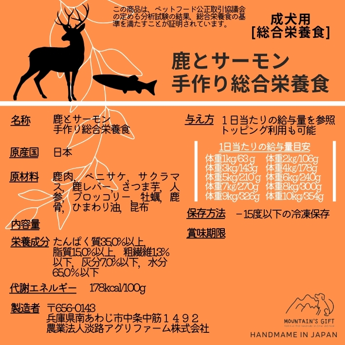 淡路島で捕獲された鹿と淡路島で養殖されたサクラマスをはじめ、国産天然食材のみを使用した獣医師監修の総合栄養食。