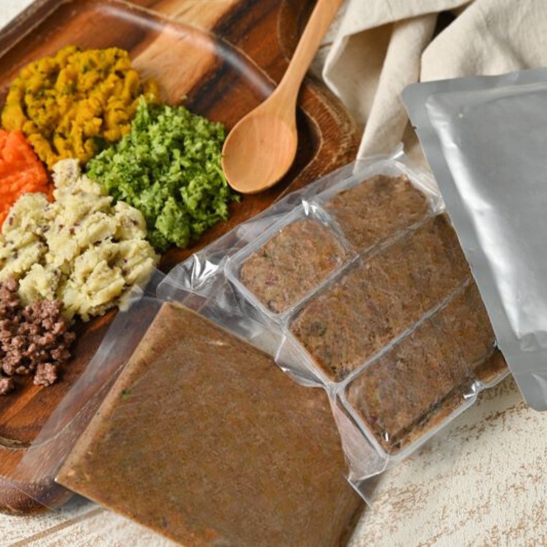 こだわった手作りごはん。 - 天然の国産ジビエ鹿肉と淡路島で養殖された名産サクラマス、そして自家農園で栽培した無農薬野菜をつかって、うちの子に食べさせたいと思うごはんを愛情を込めて手作りしています。素材は栄養価を損なわないよう、低温でコンベクションオーブンをつかって蒸しあげたものをミックスしています。