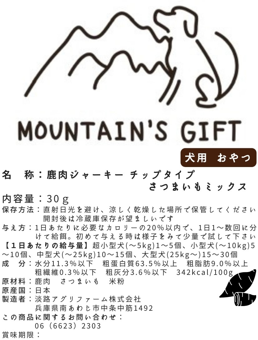 ホテルやレストランでもご利用頂いている鹿肉に、南あわじ市の自社農園で大切に育てた「さつまいも」を贅沢にミックスして、職人が低温でじっくり乾燥させました。旨みが強く残っているので食いつき抜群です。